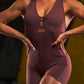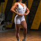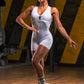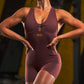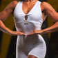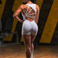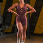 Short version of our best-selling jumpsuit: The Gymcrush. One-piece, tight-fitting workout shorts with a crossover top and exclusive back design. Gathering between the buttocks for a guaranteed "peach" effect. Ideal for training in style at the gym, inspired by the pro bikinis from overseas, but also as a dance suit, yoga, or even as a casual piece to wear for walking or doing cardio outdoors on spring days. Available in 3 colors, it combines aesthetics with functionality thanks to the stretchy, breathable materials and the support provided by the seams.